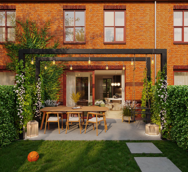 De woningen liggen te midden van twee parken, groene ‘alleys’ en verbindende ‘greens’ die zorgen voor rust, sfeer en ontmoeting.
